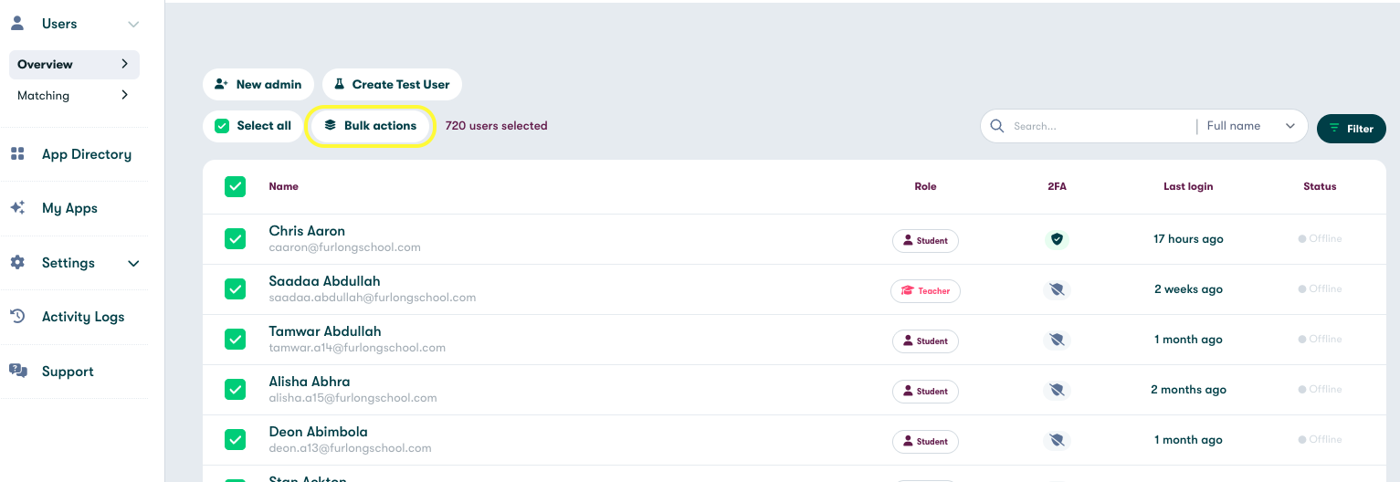 To get your user credentials in smaller batches you can filter by year, registration, house or class. Simply click 'Filter'.