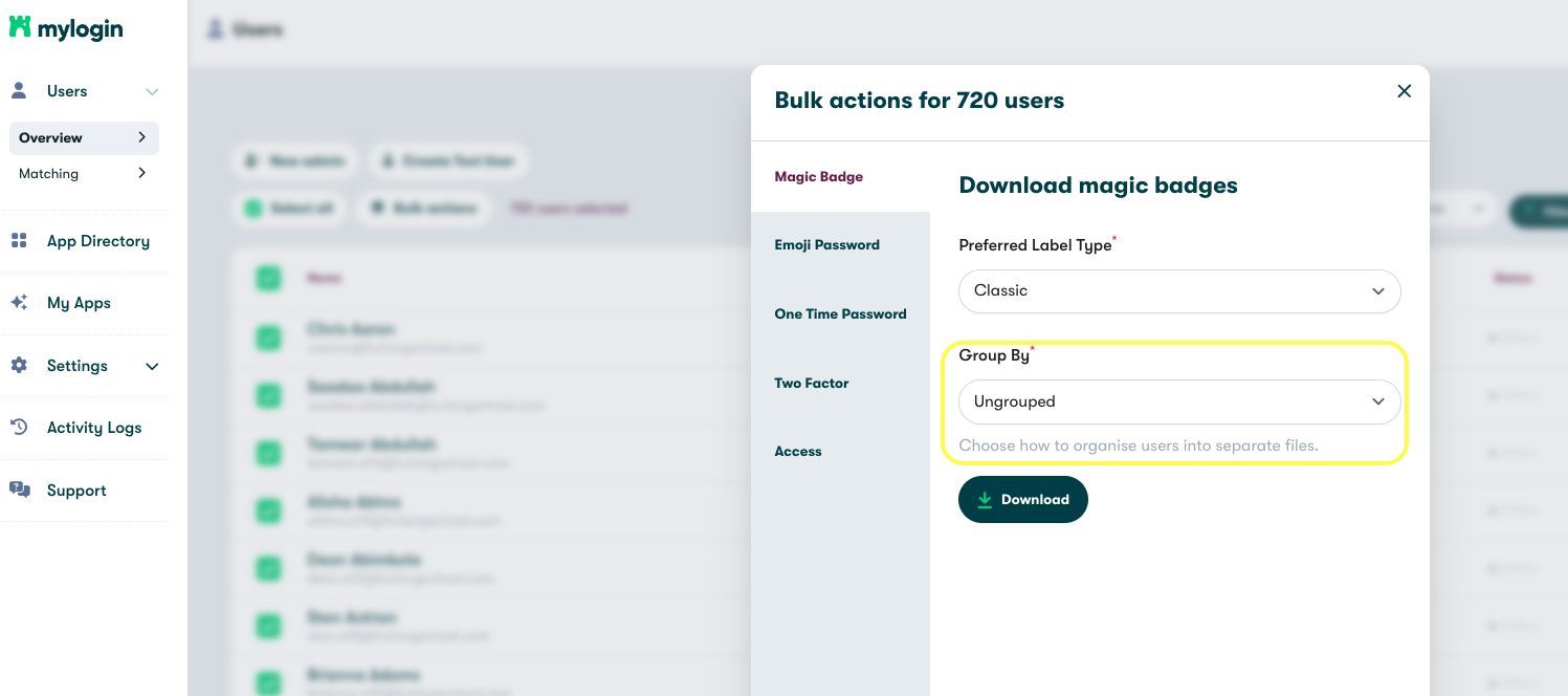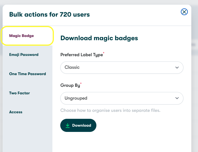 Magic Badges and Emoji Passwords will download as a PDF file, One Time Passwords will download as a .CSV file.